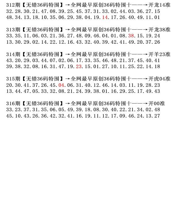 314期 精选七不中 〖11-21-24-39-43-45-48〗 314期 开: 29-44-37-19-26-38 T23 准 |